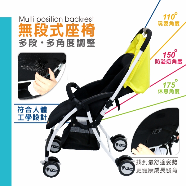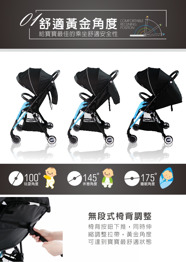 - 座椅無段式調整,可坐可躺