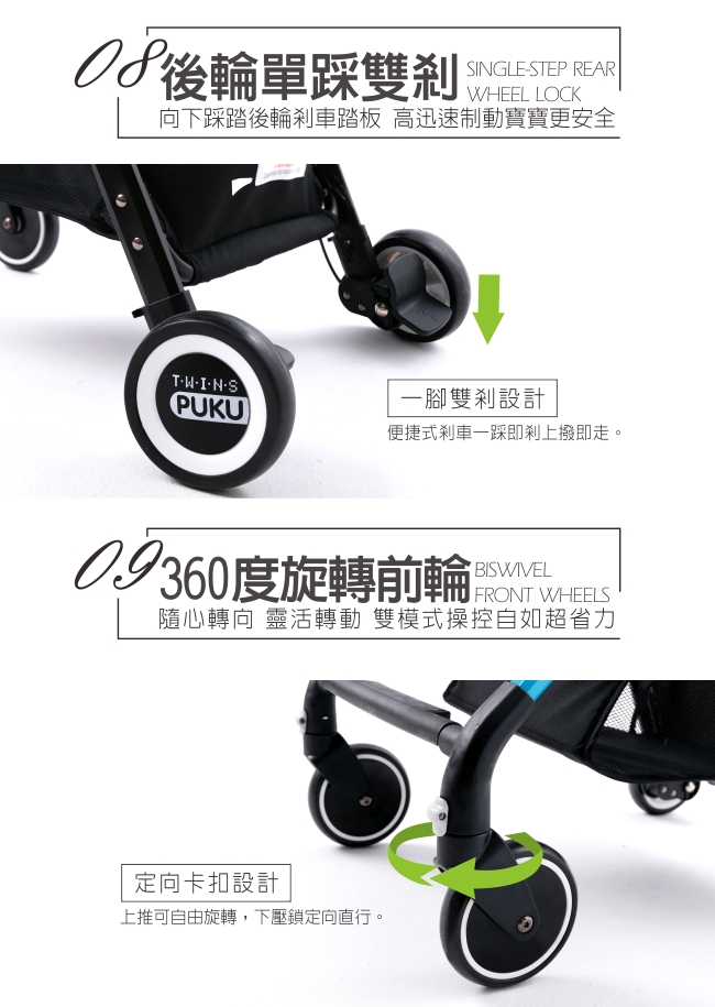 前輪360度/直行切換調整,後輪雙邊踩剎功能